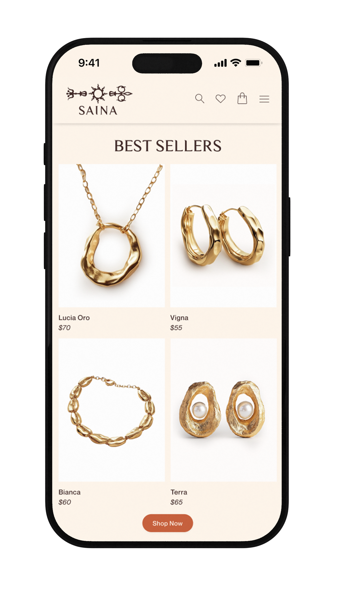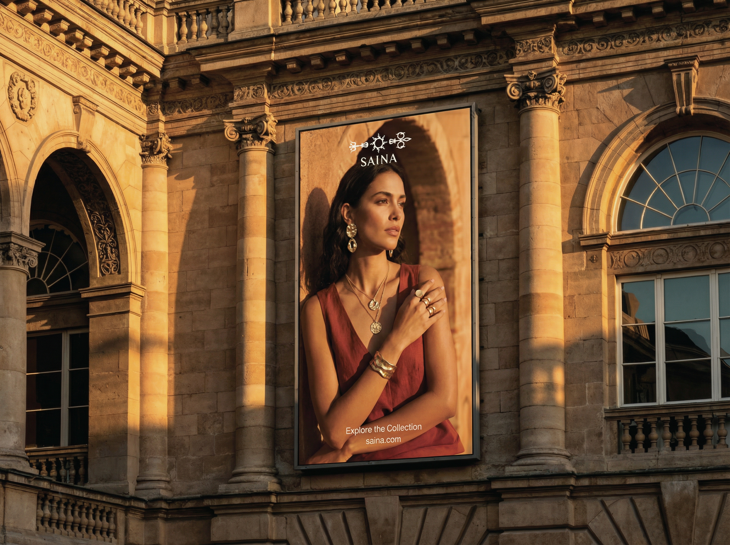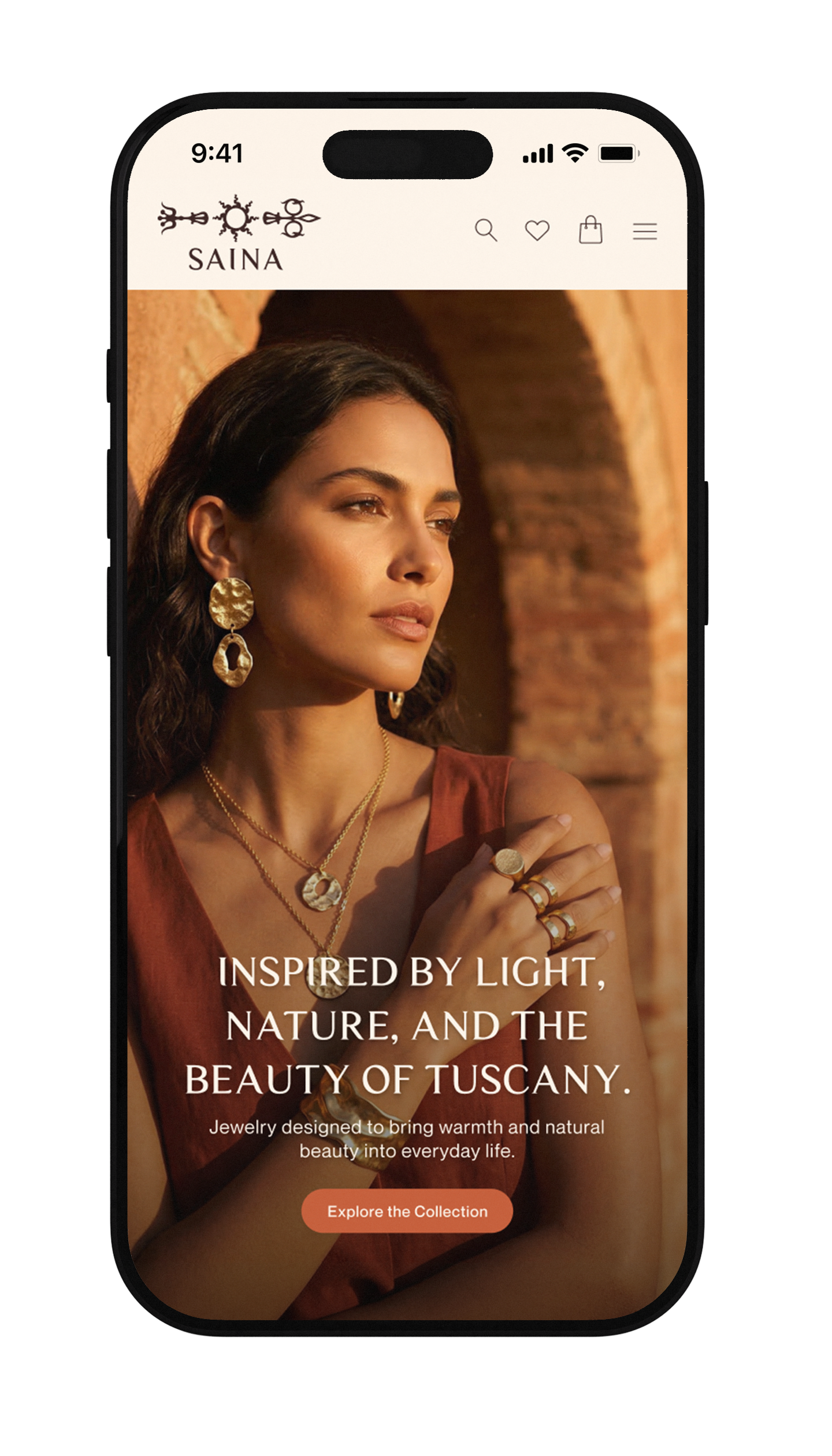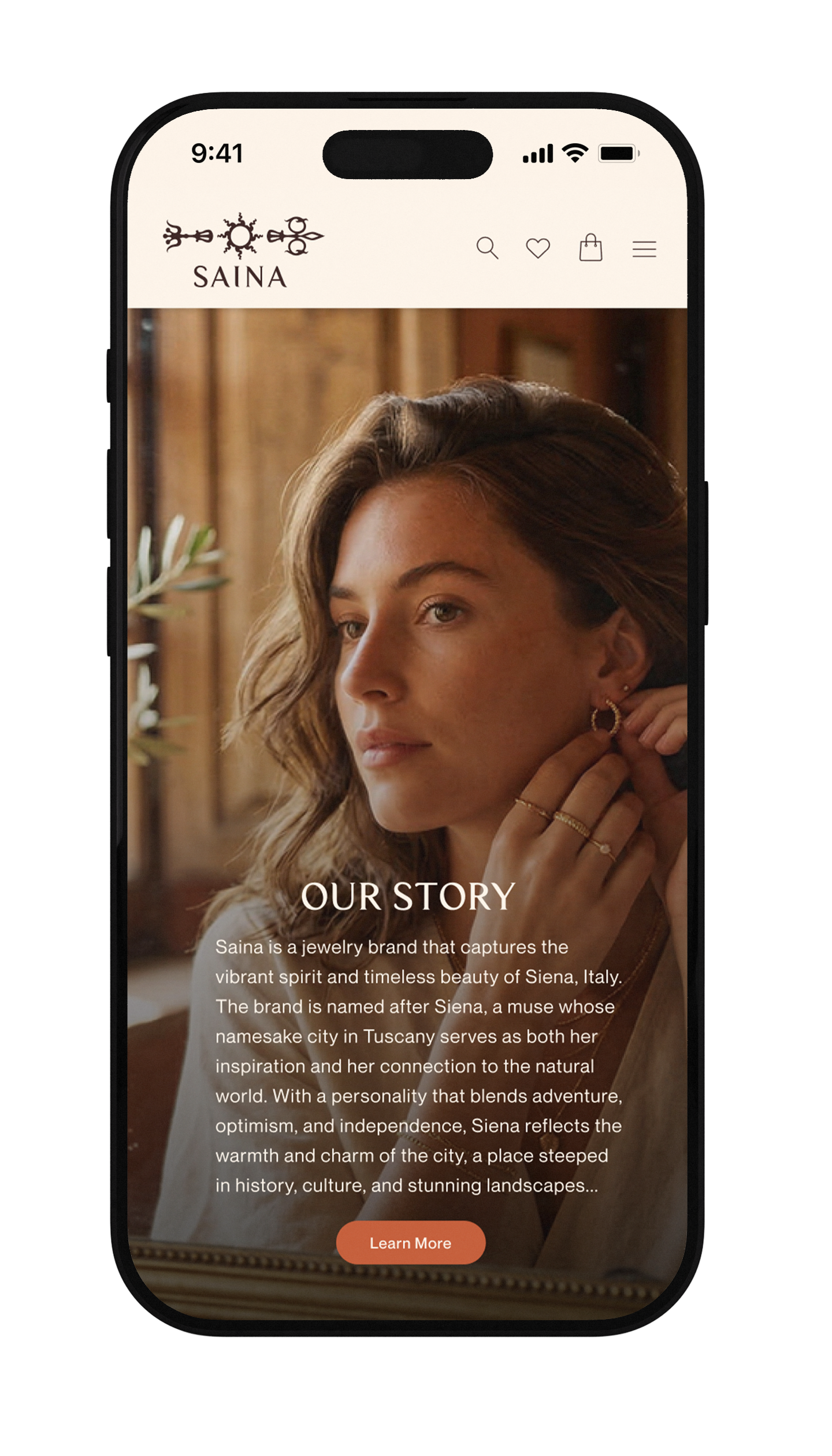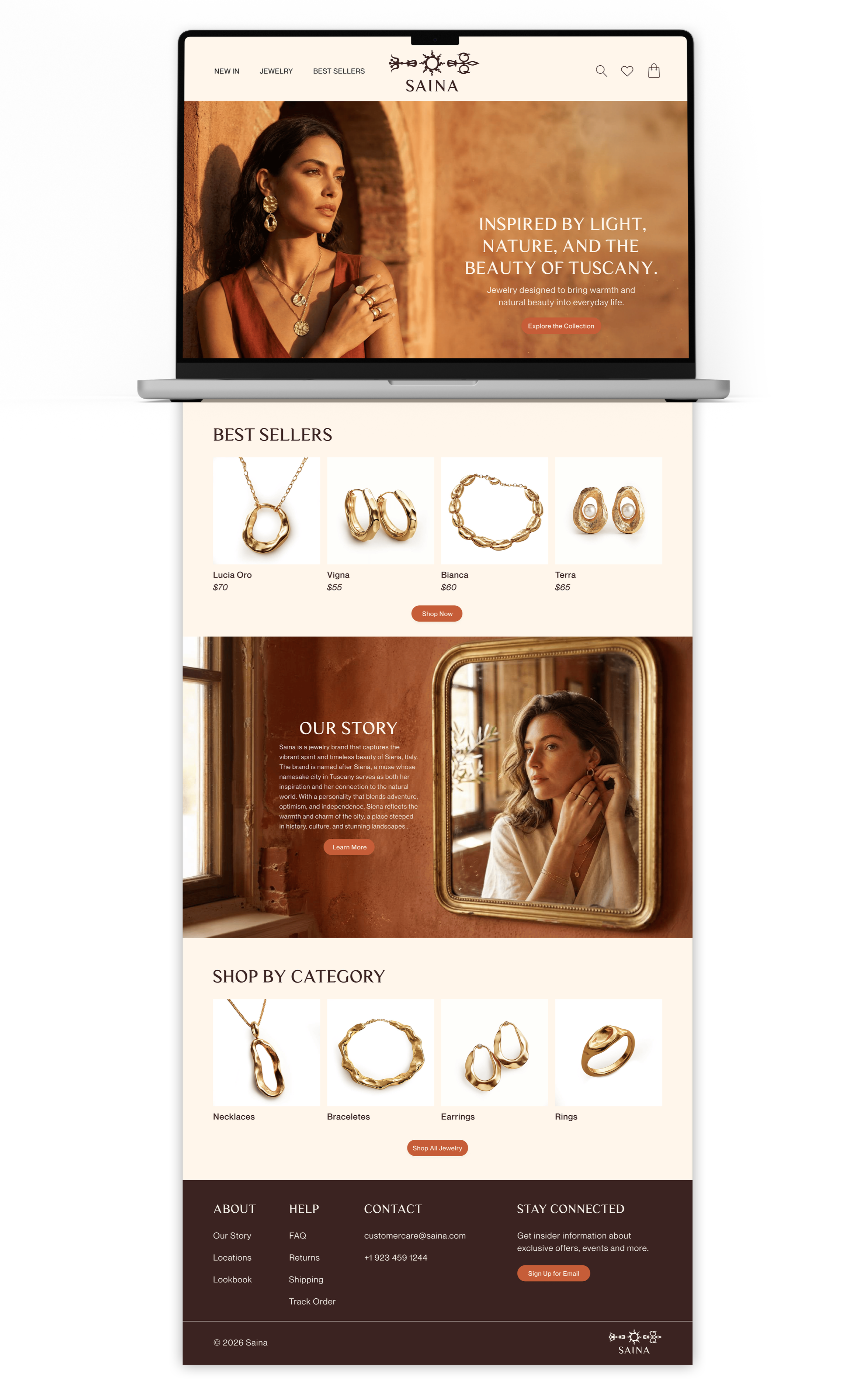 Saina is a jewelry brand inspired by my classmate Siena and her sunshine-filled, nature-loving personality. The company’s design is inspired by the colors and architecture of Siena, Italy, my classmate’s namesake. The sun and clock hand in my logo is inspired by the one in Piazza del Campo, and its burnt sienna color, is also a nod to this city that basks beneath the Tuscan sun. As Siena’s style of jewelry is so unique, I used AI to create all of the imagery on the website.